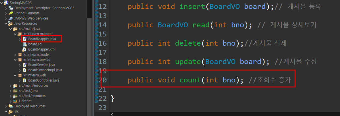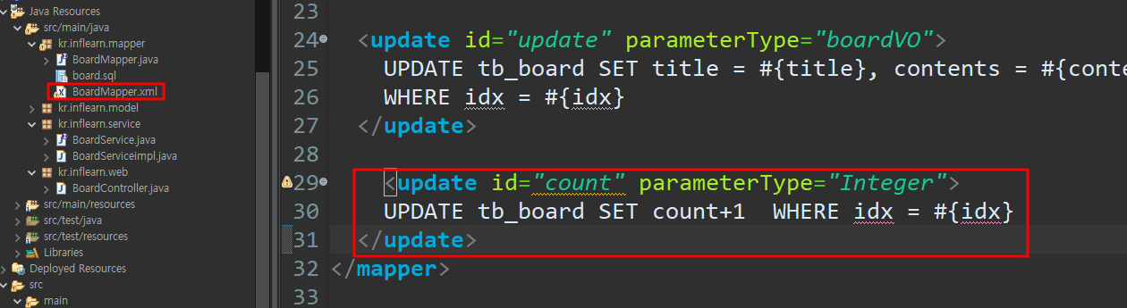 그다음 서비스층에서 문자열하나 받을수 있게 추가 그리고 xml에서 만든 count 함수 가져오기