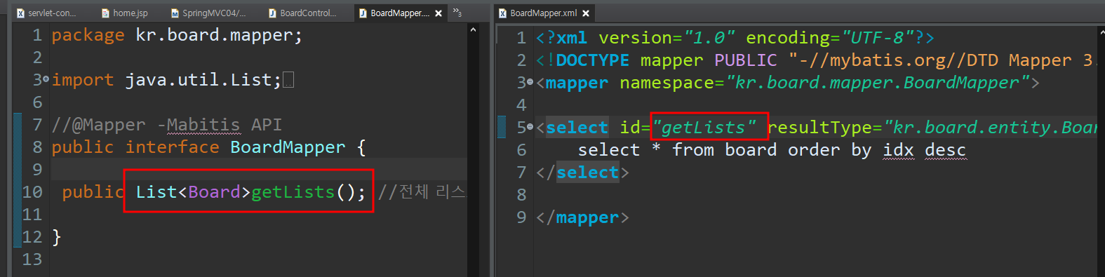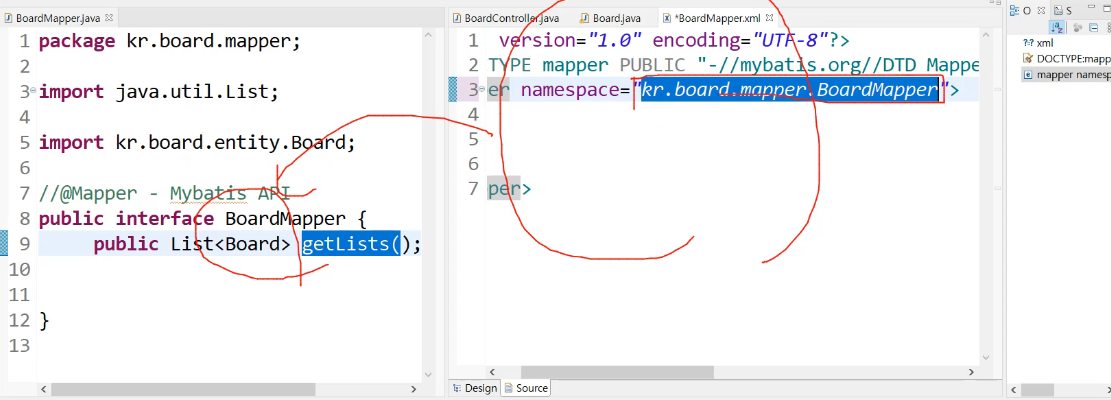 인터페이스에 있는 추상메소드의 이름과 마이바티스에 있는 태그 안에 있는 id= "getList"의 이름을 일치시킴