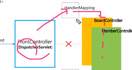 프론트컨트롤러 --> 핸들러맵핑 --> 포조 컨트롤러로 가는 순이다