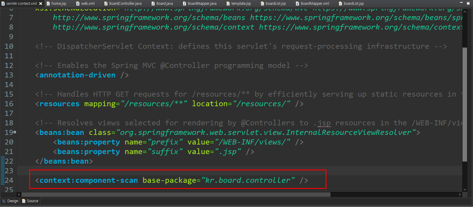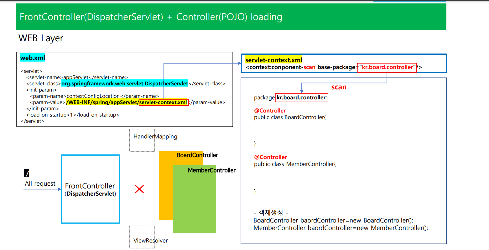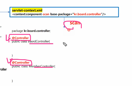 component-scan을 통해 kr.board.controller 안에 있는 객체(pojo) 들을 스캔해라