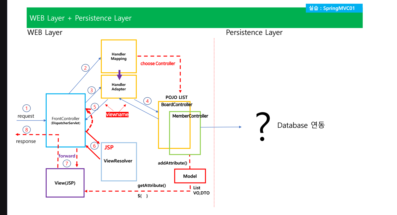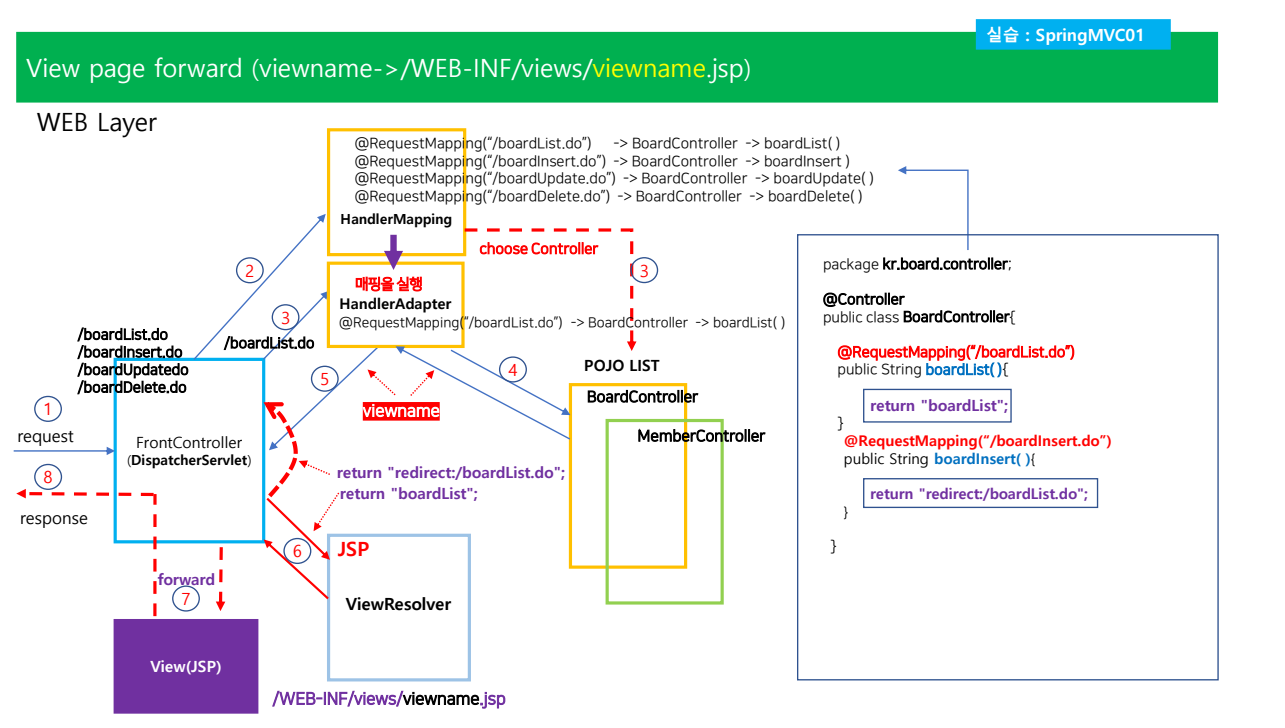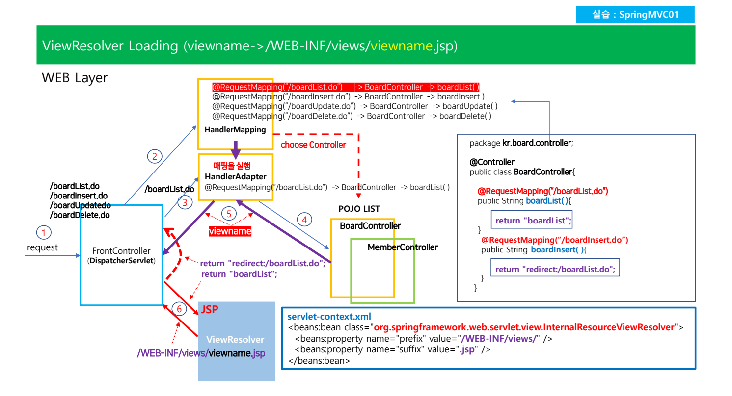 리턴값을 다시 프론트컨트롤러로 넘김 --> 그다음 ViewResolver 로 감 veiwe Resolver 는 프리픽스 서픽스를 붙이서 전체적인 물리적인 경로를 붙이는게 viewResolver의 역활