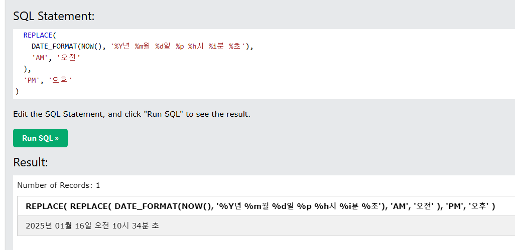 DATE_FORMAT(NOW(), '%Y년 %m월 %d일 %p %h시 %i분 %초'),